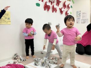 丸めた紙を雪玉に見立てて、雪合戦遊びをする
