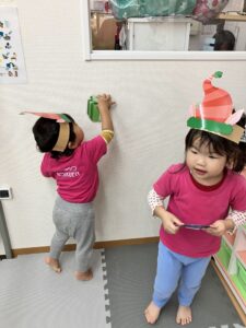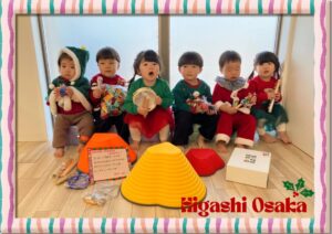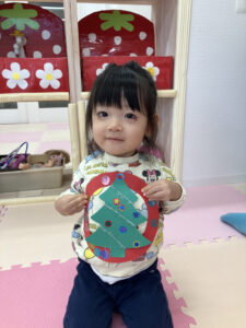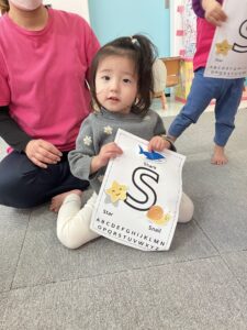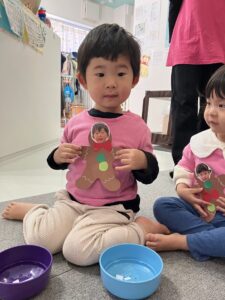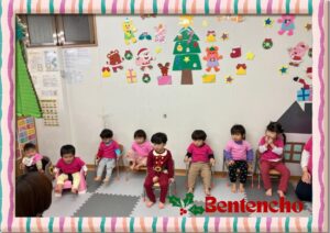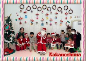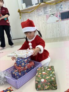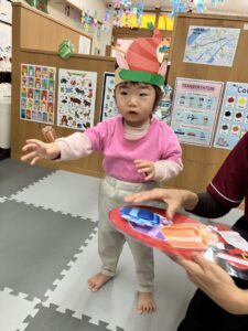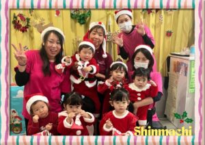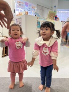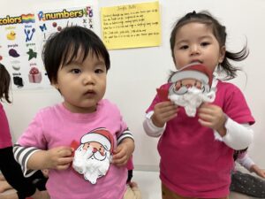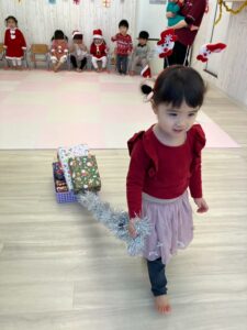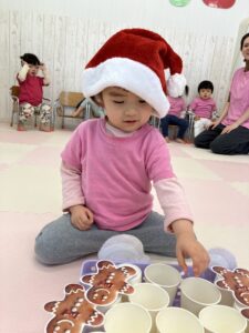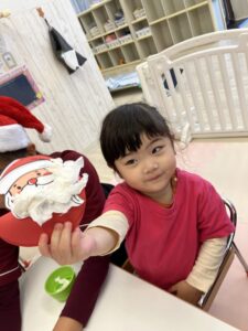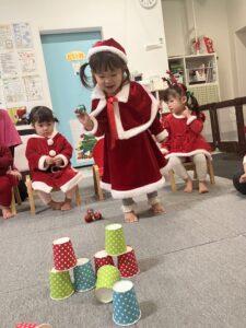 Reindeer(トナカイ)、Snowman(雪だるま)、Santa(サンタ)にそれぞれ「Hello!」と挨拶しながら、数字を数えたり、途中で他のクリスマスソングが登場したりと、まるでクリスマスメドレーのような楽しい歌です🎅❄️トナカイ・雪だるま・サンタのワッペンを胸につけて、ダンスしながら元気いっぱい歌う子どもたちの姿は、とても可愛らしかったです💖✨クッキーになりきって🍪食べられないように逃げるGingerbreadman ごっこもとても面白かったです🎄クリスマス会では、たくさんのゲームにも挑戦し、笑顔いっぱいで楽しく遊びました🎁🎉