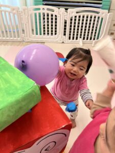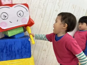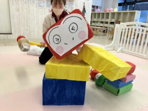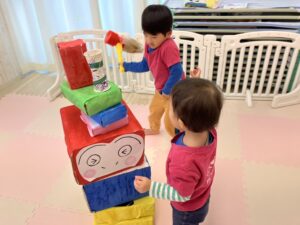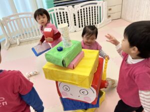 お正月遊びでは、だるま落としやけん玉や凧揚げに挑戦し、伝承遊びを楽しみました。