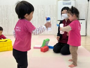 ピアノの音が止まれば、お友だちと手を離して「ばいば〜い」と、別のお友だちを見つけ、また手を繋いでいますよ!