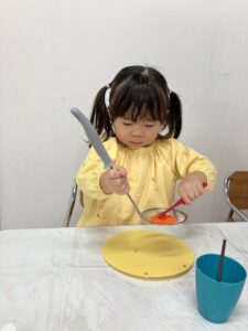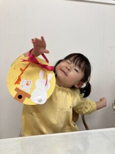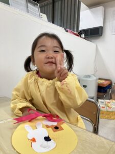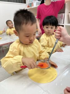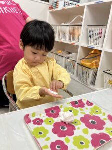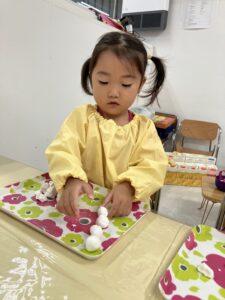 スパッタリングで月の模様を描く製作をしました!!上手にブラシを動かして網から出てくる絵の具できれいな模様をつけていましたよ♪模様が出来たら、三方とお月見団子とうさぎを貼って完成です☽そのあとは、お月見団子を作りました。保育者が丸める見本を見せると、「コロコロ〜」と言いながら真似をして上手に作っていましたよ⭐︎コツを掴んだ子どもたちは夢中でたくさんのお団子を作っていました◎思わず、「おいしそ~」と声が出てしまう子どもたちでした♡