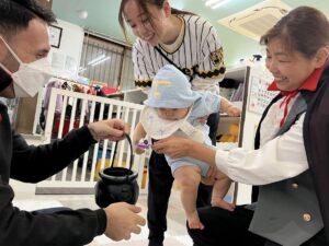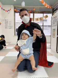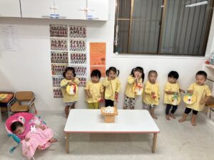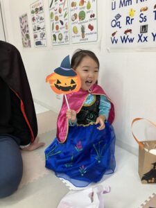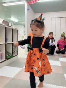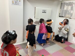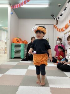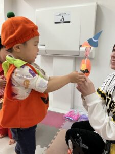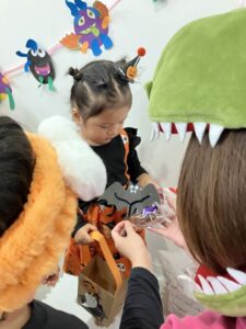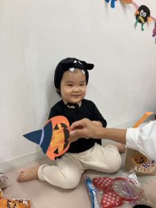 待ちに待ったハロウィンパーティー🎃可愛らしい仮装で登園してくれました♡保育者に「かわいい~!」と声を掛けられて照れたお顔を見せてくれるお友だちやいつもと違う雰囲気に少し緊張気味のお友だちもいましたが、だんだんと笑顔が増えていき、みんなで一緒に楽しむ姿が見られました。あいにくの雨模様でお外には出られませんでしたが、お部屋の中でゲームやダンスをして大盛り上がり♪最後には、それぞれのお部屋をまわり、保育者の元へ「Trick or Treat!」と元気に言いに行きました!プレゼントをたくさん受け取るとにっこり笑顔でうれしそうな表情が可愛らしかったです♡特別な1日をみんなで楽しむことができました🕸