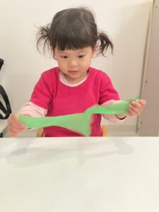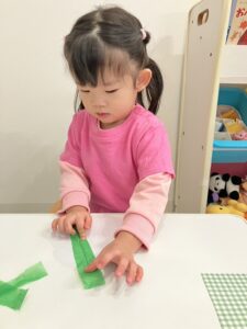 緑色の花紙と折り紙をビリビリに破いてツリー形の画用紙にペタペタ貼りました!