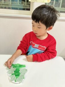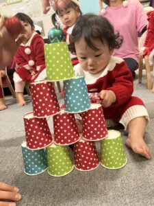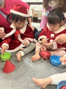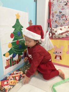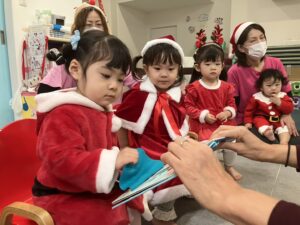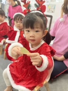 プレゼントを先生から貰うと「みて!サンタさんいる!」や「かわいい〜」と言って喜んでいました♪