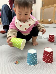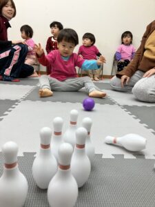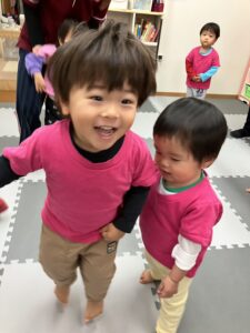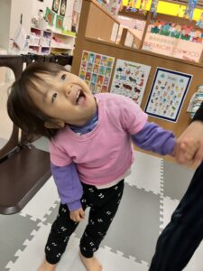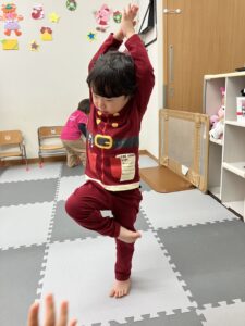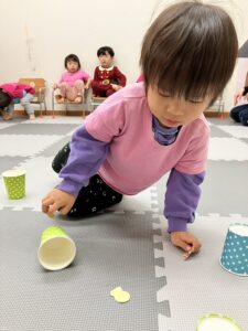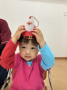 クリスマス会が始まると、ダンスをしたりゲームをしたり、みんなニコニコ笑顔。紙コップの中からシールを当てるゲームでは、「どれにしようかな…」と真剣に選ぶ姿もあり、当たりのシールが出ると「スノーマン!」「サンタさんだー!」と大喜びしていました。