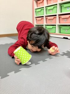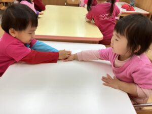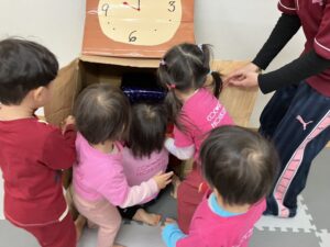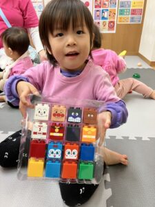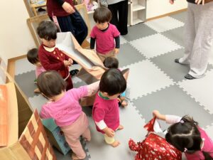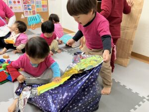 「なになにー⁈」と勢いよく開ける子、「ブロックだー!!」「おままごともあるー!!!」と嬉しさを全身で表す子など、どの子も目を輝かせながら新しい玩具に夢中になって遊んでいました。