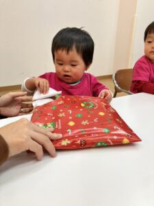 会も終盤に差し掛かった頃、突然インターフォンが鳴り、どこからか鈴の音が…。子どもたちは「えっ⁈⁈」と驚きながらキョロキョロ。気づけばサンタさんからのプレゼントが届いていて、みんな大喜びで包みを開けていました。