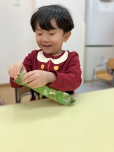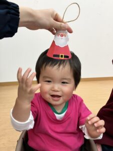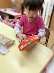 プレゼント回しゲームでは、順番に包装をめくっていくドキドキの時間。中からクリスマスのクリップが出てくると、「うわー!!やったー!!」と目をキラキラさせて大興奮。職員も思わず笑顔になってしまうほどでした。