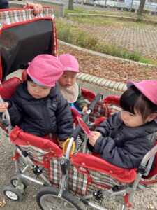 公園までの道のりも、保育者と手を繋いで歌をうたったり道路を走る乗り物を見て大はしゃぎの子どもたち!
