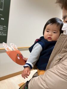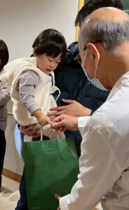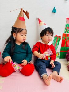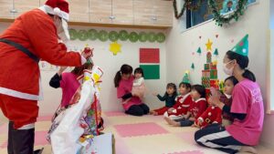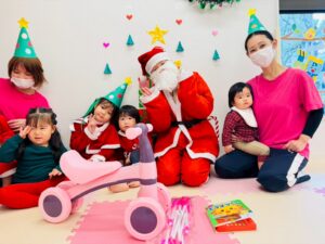 みんなの楽しそうな声が届いたのか…サンタさんもやって来てくれました!プレゼントをもらうと、少し緊張しながらも「ありがとう」とお礼を言うことができましたよ♪その後は「どこからきたの?」と質問するなど、サンタさんに興味津々な子どもたちの様子が可愛らしかったです♡