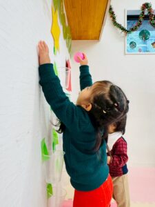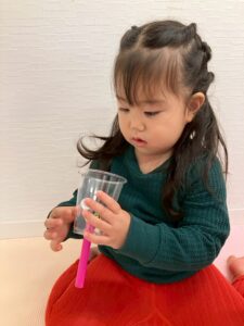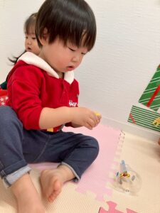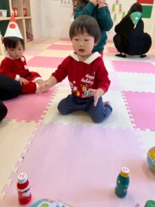 クリスマスにちなんでクリスマスのピンを倒すボーリングをしたり、ツリーに見立てたカップにボールをシュートしたりと、楽しんで遊ぶ姿でいっぱいでした。