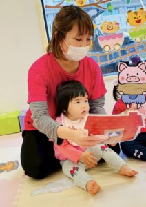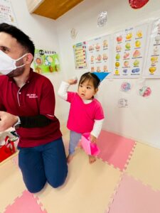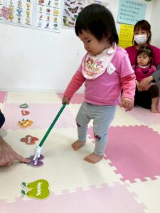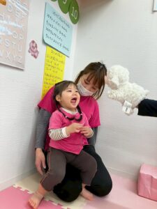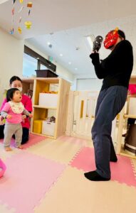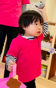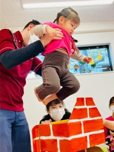 オオカミ役は「フーフー」と息をかけてお家を飛ばす真似をしたり、こぶた役の子どもは「NO」とセリフを言うなど存分に楽しめました。