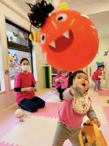 お面や新聞紙の豆を作り準備万端で当日を迎えると、鬼に見立てた風船やペットボトルを次々に倒して遊んでいた子どもたち。