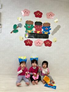 しばらくすると保育園にも鬼が登場し、びっくり顔の子どもや涙している子どももいましたが、新聞紙の豆を投げてみごとに鬼退治ができました。