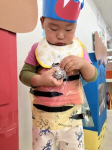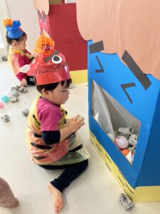 すると赤鬼が登場!!!怖くて泣いてしまう子や、一生懸命ボールを投げる子などいましたが、怖くて泣いてしまった子も途中から福の神が登場すると、勇気を振り絞って鬼に向かいボールを投げる姿が見られました。