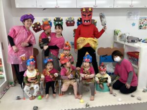 その後、豆まきのお話を聞いてからお部屋を移動し、鬼に大変身!!