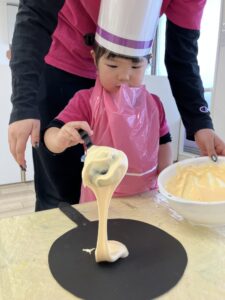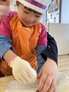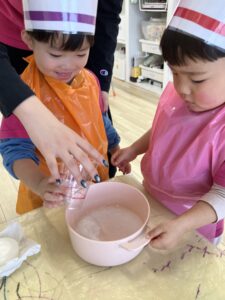 2歳児さんはすりおろし器で石けんを削って細かくし水を加えると、クリームに見立てて泡立て器で混ぜ混ぜ……泡が増えていく様子を楽しんでいました♪