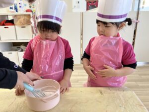 バレンタイン製作は『しろくまちゃんのホットケーキ』のホットケーキ製作をしました!