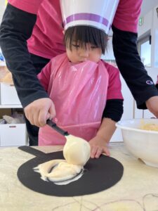 まずは絵本を読んでからお菓子作りへのイメージを膨らませ、みんなでコックさんに大変身☆