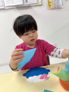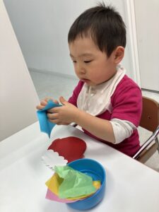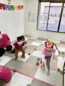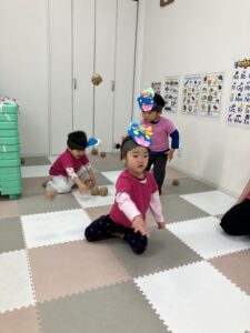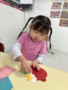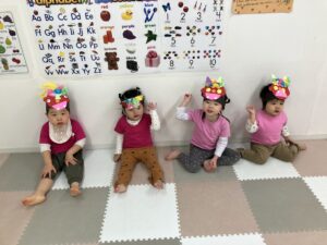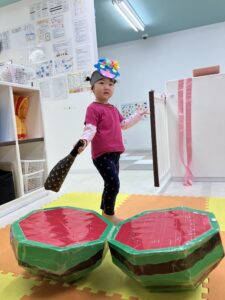 今月は、節分の会がありました。まずは、鬼のお面作りです!花紙を小さく丸めてペタペタ…カラフルな髪の毛の、可愛らしい鬼のお面が完成✩完成した鬼のお面を頭に付けて、すいか割りに挑戦です!鬼になりきり、金棒を持って力強くドンッ!と一撃で割っていましたよ👹割れると「いぇ~い!」と大喜びな子どもたちです☺そのあとは、【赤鬼】・【青鬼】のチームに分かれて、豆まきや歌唱対決をしました♪豆まきは時間内に相手チームの陣地にボールを投げるというルールでスタートです!絶対に負けたくない‼と強い気持ちで、一生懸命ボールを投げ続けていましたよ!2,3個のボールを一緒に投げ入れるという頭脳派のお友だちもいました⋆負けて悔しくなり、目がウルウルしているお友だちもいましたが、2回戦、3回戦と気持ちを切り替え最後まで泣かずに挑戦する姿がみられました。勝った瞬間にはキラキラ笑顔を見せてくれました♡大盛り上がりとなった豆まき。「もう1回するー!」と最後まで元気いっぱいの子どもたちでした☺
