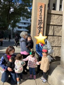 たくさん遊んだ後は、お面を被って近くの神社へ行き、節分祭のお焚き上げを見学しました。