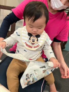 丸めた新聞紙を的に向かって一生懸命投げる姿が見られましたよ!