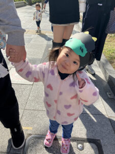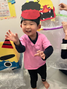 保育者が鬼になり、「イヤイヤ言っている子はどこだぁ〜」と近づくと、「おにはそとー!」と言いながら元気に鬼退治をしていました!