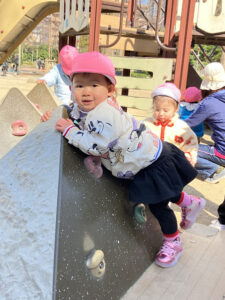 おやつの後は、滑り台で元気いっぱい遊びました!