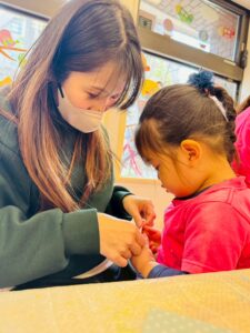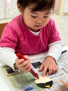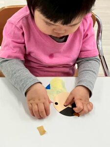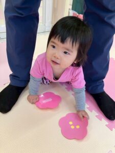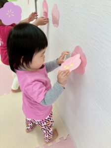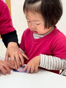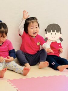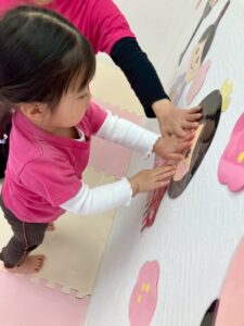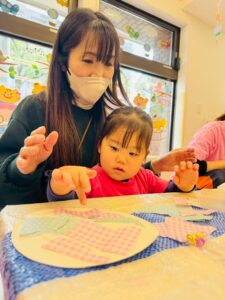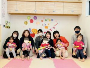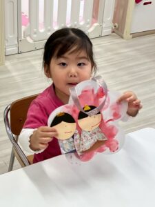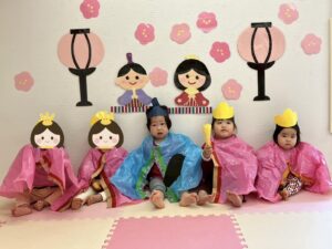 初めて折り紙を折ることにも挑戦した1歳児やシールを上手に貼れるようになってきた0歳児。1年間でできる製作も増えてきました。最後はお雛様・お内裏様の衣装を着て記念撮影もし楽しい会になりました。